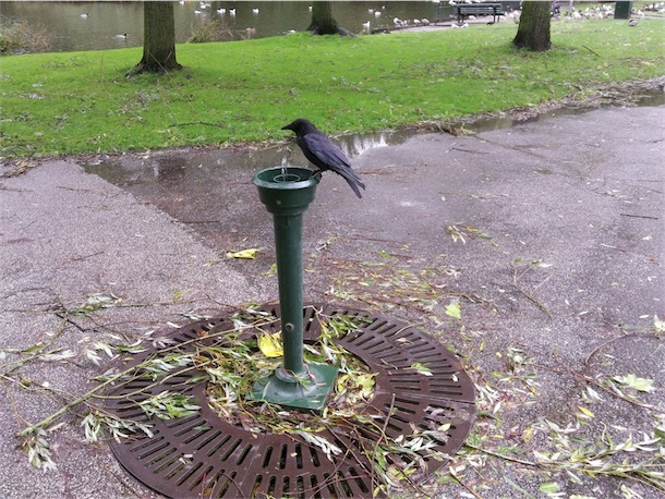 In de buurt van de uitgang, kom ik een vrouw met een rollator tegen. Op het mandje voorop zit een kraai. Hij tikt voortdurend met zijn snavel tegen een linnen tas.