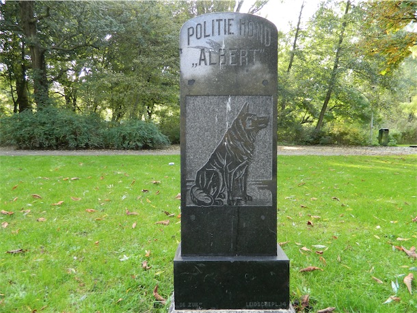 Op de plek in het Oosterpark waar de hoofdagent voor het eerst met Albert traint, is een gedenkteken opgericht. Uit de Provinciale Noord-Hollandsche Courant van 11 juni 1924: ‘De dood van den politiehond Albert, die in Maart het vorig jaar, toen zijn meester, de beambte Water, in het Burgerziekenhuis te Amsterdam verpleegd werd van heimwee stierf, was aanleiding, dat een commissie pogingen in het werk stelde, om een blijvend gedenkteeken voor het ongetwijfeld intelligente dier op te richten. Het kostte heel wat moeite een fonds bijeen te brengen, daar verschillende eigenaars van honden niet al te scheutig bleken te zijn. Ten slotte kwam het er toch van, en Zaterdagmiddag had in een stil hoekje van het Oosterpark de onthulling van een gedenkteeken plaats. Dit plekje is achter de melk- en limonadekiosk gelegen en hier is het, dat Albert voor het eerst door zijn baas in het speuren werd geoefend.’