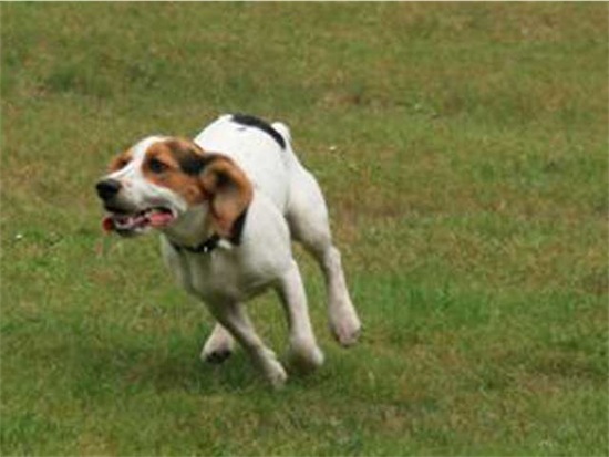 Dada is een wit met bruin en zwart gevlekte beagle-achtige die op een zondag-