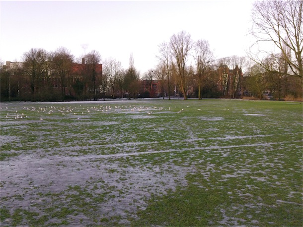Een tijdje geleden reden twee handhavers met hun scooters dwars over het zompige veld om mij in het midden op de bon te slingeren. Weken erna waren de diepe sporen van hun wielen nog zichtbaar. Dan vraag je je toch af wie brengt hier de grootste schade toe? Toch niet die onschuldige man met zijn lieve hond? Die honderdtwintig euro van me kan het Stadsdeel besteden aan graszaad om de gemaakte sporen weg te moffelen.