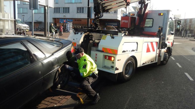 Ondertussen trekt hij het portier open en grijpt naar de handrem. Hij gebaart naar zijn collega die in de sleepwagen zit. Die rijdt vervolgens achteruit en houdt halt bij de voorwielen van mijn auto.