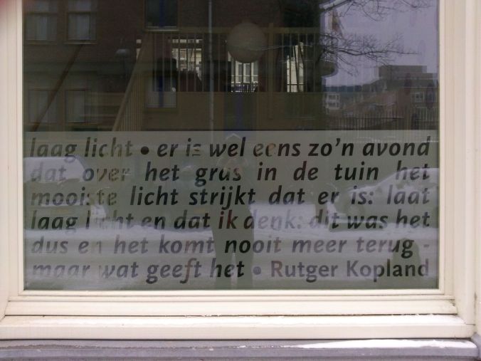 In de reeks Sculpturen van Oost ditmaal ‘Gedichten op gevels’ met een gedicht van Rutger Kopland. En wel met de vierde strofe uit het gedicht De kunst van het doodgaan, dat op het raam van Theater Veder in de Derde Oosterparkstraat 88 staat.