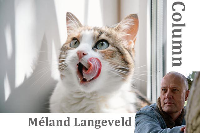 Aanhoudend geklepper van het kattenluik maakt me nieuwsgierig. Verdedigt Joris, mijn kat, zijn toegangspoort? Het is daar vaker een strijd op leven en dood. Een homp vlees priemt deels door het luikje. Ditmaal geen rivaliserende kat, maar een rollade die de strijd met het deurtje aangaat. Ik kijk door de ruit van de keukendeur en zie mijn zwarte kat hemel en aarde bewegen om zijn zojuist gevangen prooi naar binnen te werken. Wat een gevaarte hangt er aan zijn bek; zijn tanden heeft hij in het netje gezet. Waar heeft hij die nou weer vandaan? Hopelijk niet bij mijn naaste buren waarmee ik in een onoplosbare vete verkeer.