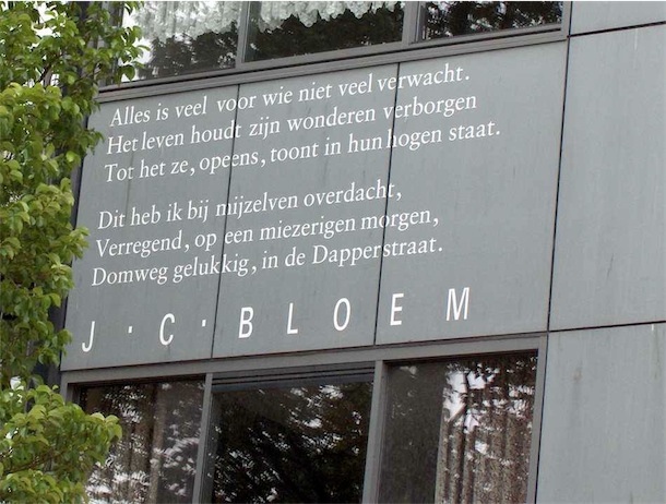 In de reeks Sculpturen van Oost ditmaal ‘Literaire teksten op gevels’, en wel het gedicht ‘De Dapperstraat’ van J.C. Bloem (1887-1966). Het gedicht staat in zijn geheel op een gevel in de Dapperstraat.