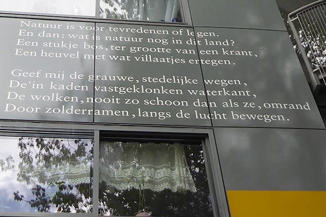Het ontwerp van het gedicht op de gevel is van grafisch vormgever Robert (Ootje) Oxenaar (1929-2017): bekend van zijn ontwerpen voor de gulden-bankbiljetten, zoals de zonnebloem, de snip en de vuurtoren. Jarenlang is hij ontwerper geweest bij De Nederlandsche Bank: ‘Ik wilde iets typisch Nederlands en iets met dieren en bloemen, maar geen molens, klompen, koeien en tulpen’, zei Oxenaar in 2008 tegen Trouw. ‘Zo ben ik op de zonnebloem en de met uitsterven bedreigde snip gekomen.’