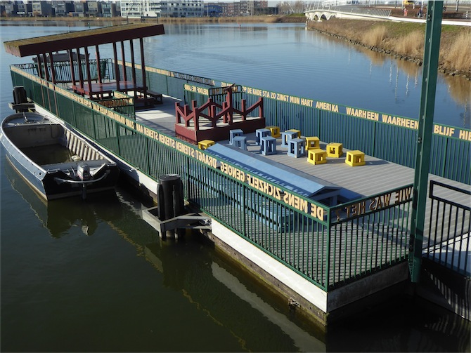 Het is een rustpunt, een plek om te verblijven, te mijmeren, te zitten, te spelen, te lezen en op te treden. De ‘Floating Poetry Room’ is een ponton, omringd door een hekwerk waarin een zestig meter lang gedicht is verwekt. Het is van de Amsterdamse dichter F. Starik. Hij zei daarover: ‘Van de kade loop je via een steiger de drijvende kamer in, je strijkt neer op een van de bankjes en wordt getroffen door bijvoorbeeld de tekst “kom dichterbij, nader mij”. Het gedicht gaat over water, het verlangen om te vertrekken en terug te komen.’