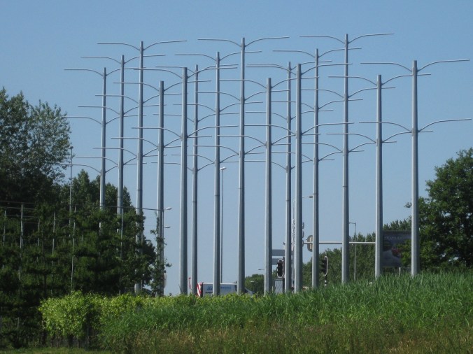 ‘Ze vertonen vergelijkbare vertakkingen als de leibomen, zij zijn de industriële pendant van de “natuurlijke” bomen die als gevolg van het snoeien uiteraard verre van natuurlijk zijn. De masten zijn vooral voor de automobilist bedoeld, als een markering van deze plaats. De leibomen zijn eerder een symbool van de controle die de mens over de natuur wil hebben. Toch zal de natuur haar gang gaan midden in dit inferno van het moderne leven. De fruitbomen zullen bloeien en vrucht dragen, daar kan geen ringweg iets aan veranderen.” (17 juni 1995)