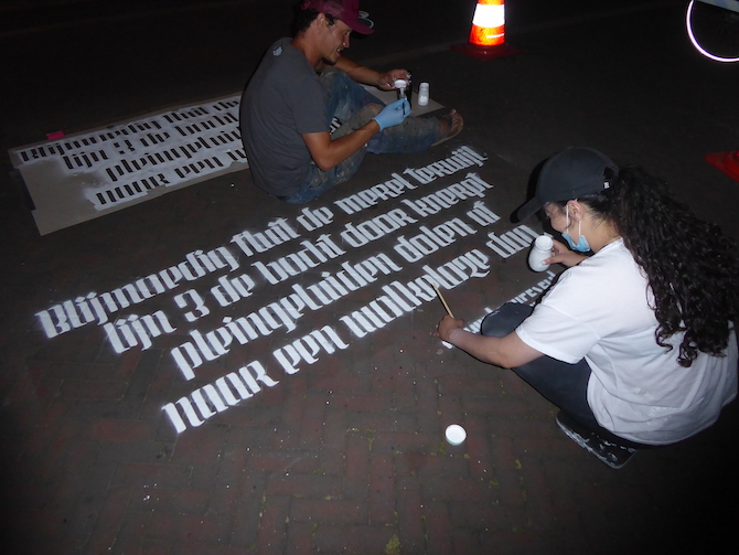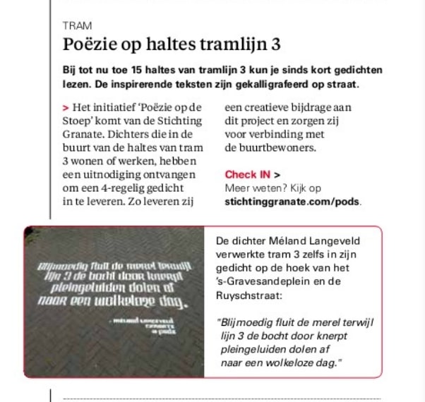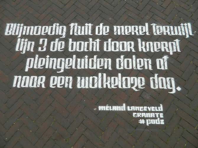 Op het ’s-Gravesandeplein in Amsterdam-Oost is een gedicht van mij gekalligrafeerd. Het betreft het project, ‘Poëzie op de Stoep’ (#PODS) van Granate. Langs tramlijn 3 in de buurt van de 25 haltes zijn gedichten aangebracht.