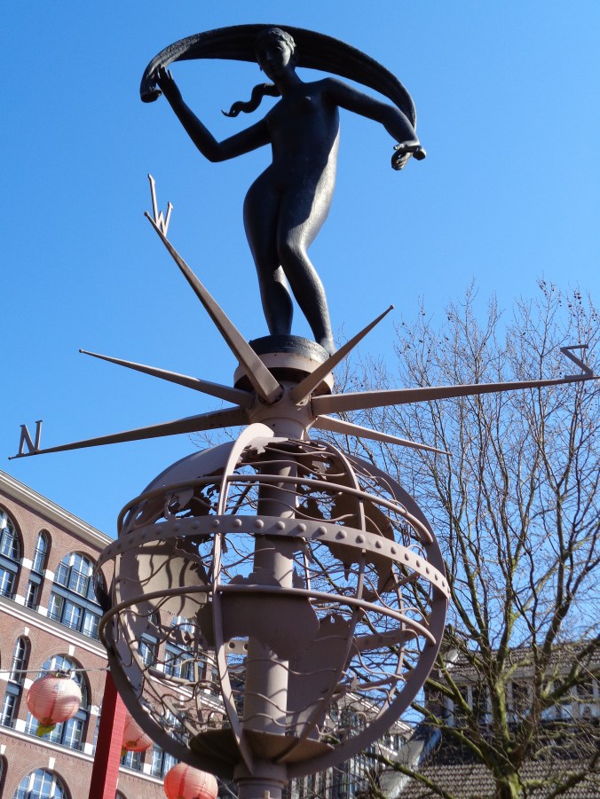 Vrouwe Fortuna is gegoten uit brons. Ze staat op een opengewerkte wereldbol met windroos en houdt met beide handen een schuin achter haar opbollend zeil vast.