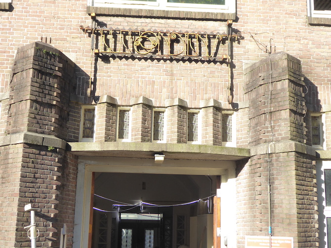 Later komt de ingang van het gebouw aan de Kamerlingh Onneslaan. Het beeldhouwwerk boven de ingang is van Hildo Krop. Het verbeeldt de vier werelddelen.